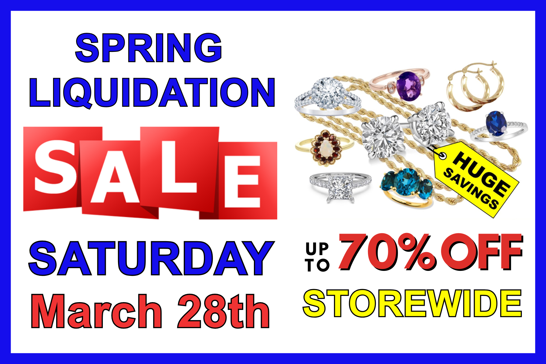 Join us on Saturday, March 28th for our STOREWIDE SPRING LIQUIDATION EVENT. Hundreds of items including Discontinued Merchandise, Returns, Overstocks, Trade-Ins, Unclaimed Repairs, Pawn Foreclosures, and even Estate Jewelry discounted up to 70% off!!